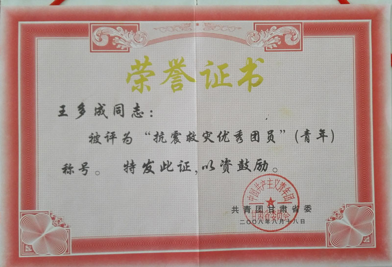 2008年榮獲抗震救災(zāi)優(yōu)秀青年稱號榮譽證書