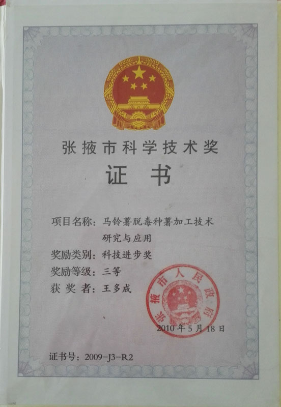 2010年榮獲甘肅省科學技術進步三等獎證書
