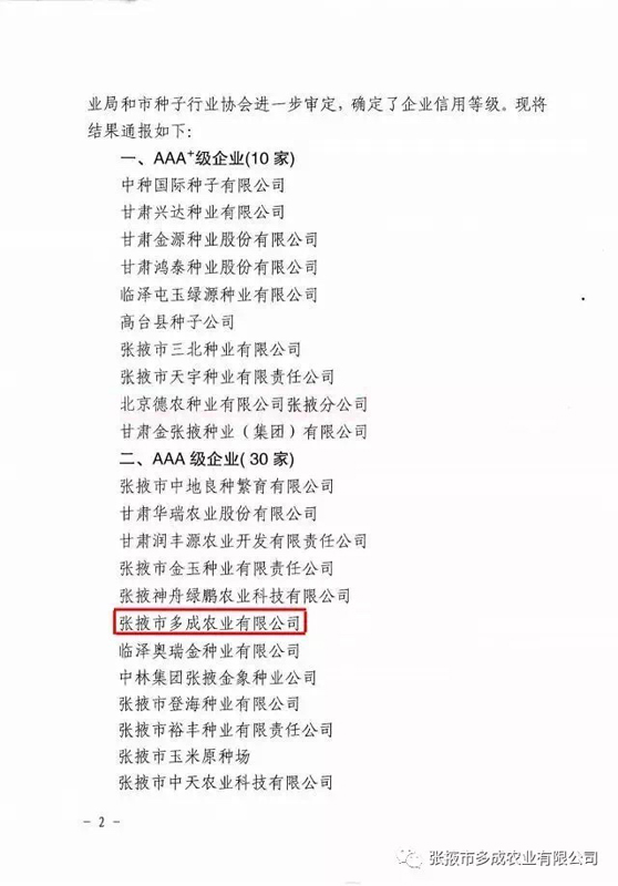 | 熱烈祝賀張掖市多成農(nóng)業(yè)有限公司被評為2017年度信用等級AAA級企業(yè)。 | ||